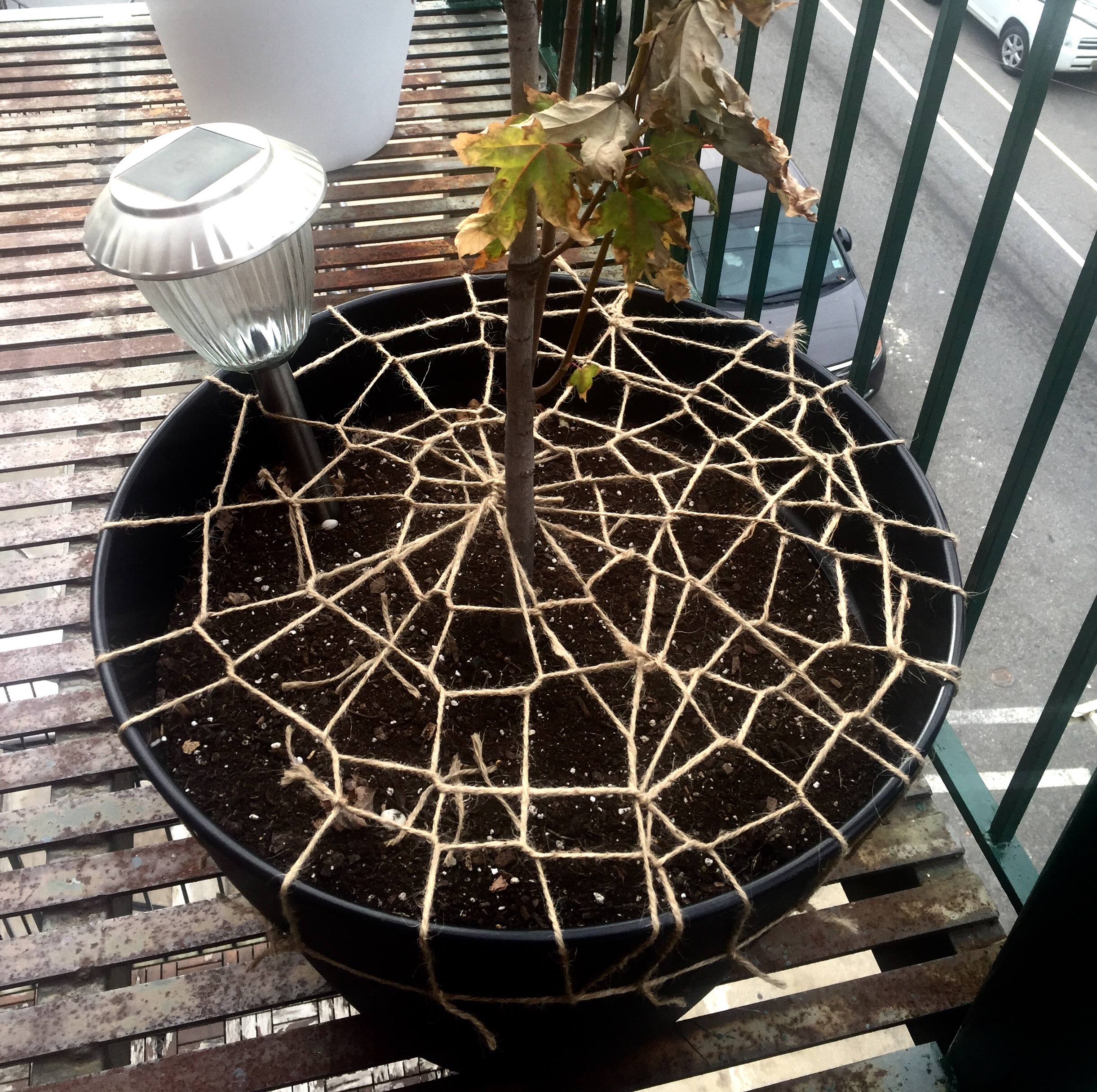 To thwart another attack from this rowdy pack, I had to deploy my spider web spinning skills. I’ve covered each planter with a web made from jute twine. For just ninety nine cents and an hour’s labor, I’ve protected my tender baby bulbs from becoming squirrel snacks.