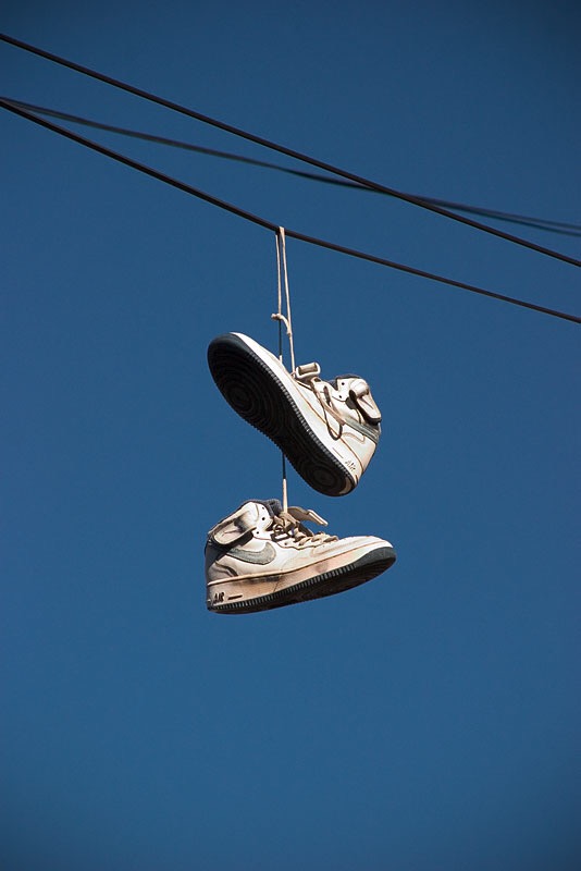 Have you ever wondered what those sneakers hanging on the telephone wire mean? Well, there’s an urban myth that says that those seemingly random dangling sneakers indicate a place where you can buy drugs. I don’t know if it’s true and I haven’t ever tried to find out, but the myth does make me wonder – are there drugs stashed close by those old sneakers?