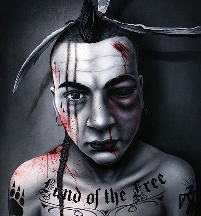 One of the most important paintings in my own collection is titled “Home of the Brave” by the young San Francisco artist Monty Guy. It depicts a battle-scarred American Indian wearing traditional war paint on his face along with a black-eye. Blood splatters his face and body. Across his chest the words Land of the Free are tattooed. When I came across the painting at an art opening a couple of years ago, it took my breath away. My husband Enrique and I stood transfixed as we both realized we were standing in front of a masterpiece. That night I had a hard time sleeping and the following morning I woke knowing that I had to buy the painting. I immediately emailed the gallerist and purchased it. I wasn’t sure why the painting resonated with me so strongly. I just knew I couldn’t live without it. That sounds absurd, I know, but, it’s true. Home of the Brave now lives on a wall in our bedroom and is the first thing I see every morning. Sometimes, when the sun is coming up and the lighting is just-right, the young Indian Brave is encircled by an aura. It’s haunting.